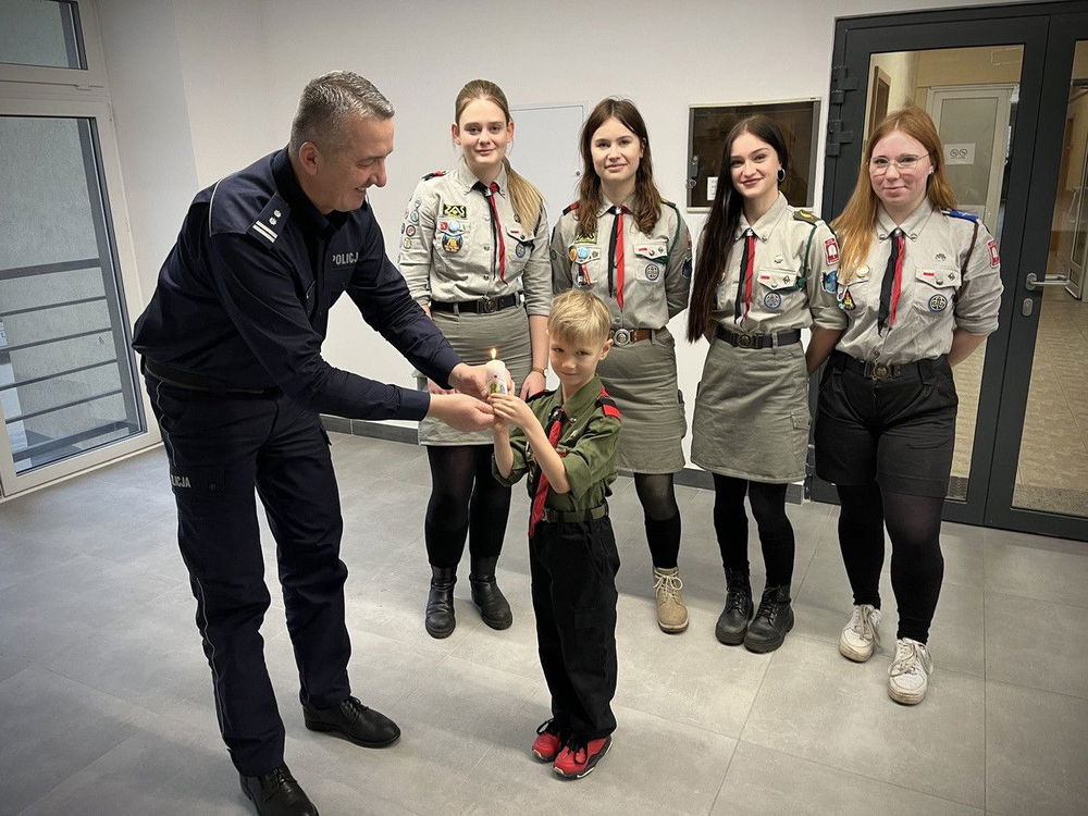 W trakcie wizyty młodszy inspektor Mariusz Siejka podziękował harcerzom za pamięć i przekazanie światła oraz złożył życzenia świąteczne.