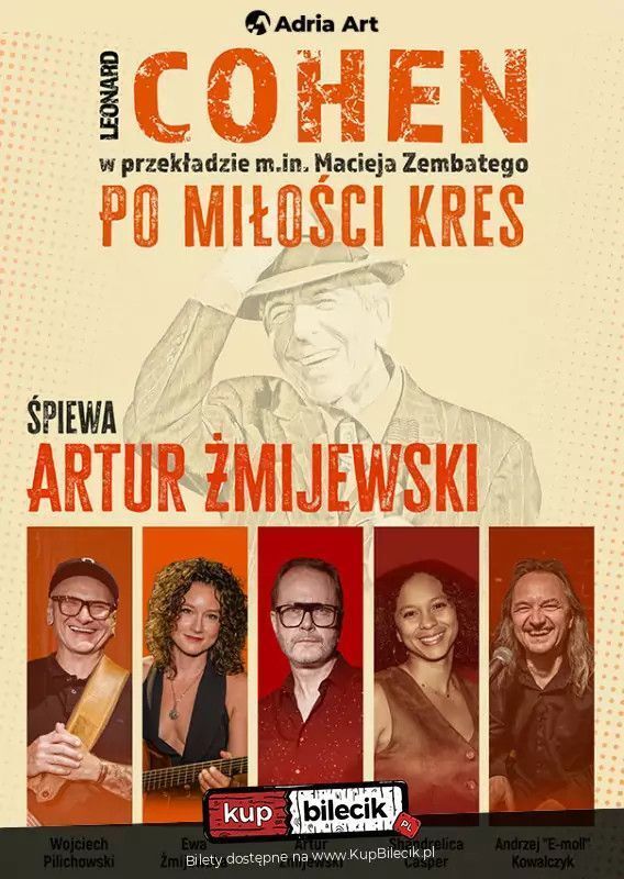 Artur Żmijewski, jeden z najbardziej znanych i cenionych polskich aktorów, tym razem zaskakuje w nowej roli, prezentując program muzyczny z utworami Leonarda Cohena. Na koncertowej scenie usłyszymy takie utwory jak "Alleluja", "W tajnym życiu mym" (In My Secret Life), "Zuzanna", "Tańczmy po miłości kres" (Dance Me To The End of Love), "Wspomnienie" (Memories) oraz wiele innych. Każdy z nich, dzięki doskonałym tłumaczeniom autorstwa Macieja Zembatego, Romana Kołakowskiego i Michała Kuźmińskiego, zyskuje nowe życie, wprowadzając słuchaczy w świat pełen poezji, emocji i głębokiej refleksji.