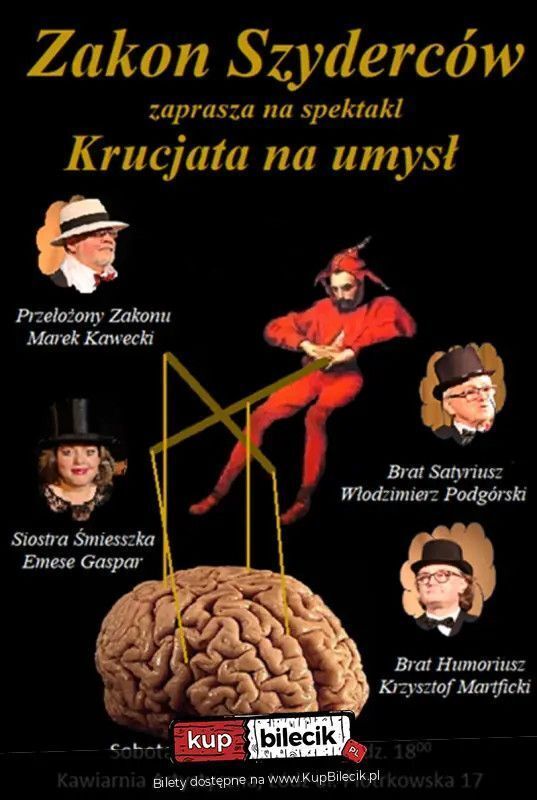 Już wkrótce scena zapłonie od inteligentnej satyry i bezkompromisowego humoru! Zakon Szyderców to kabaret literacki zmuszający do myślenia i refleksji. Spektaklem "Krucjata Na umysł" chcemy skutecznie walczyć z głupotą otaczającego nas świata. Gra słów oryginalne piosenki i skecze wprowadzą Państwa w znakomity nastrój i humor.