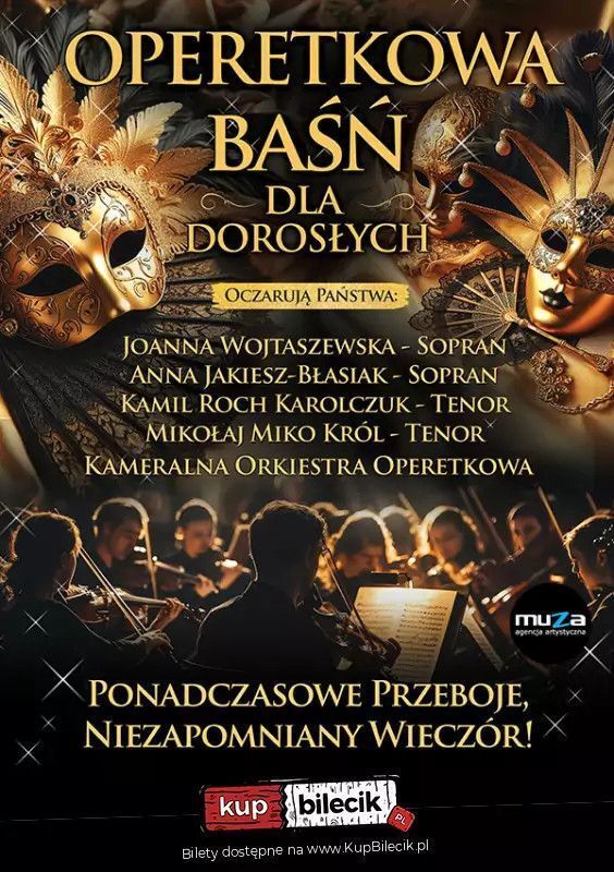 Kameralna Orkiestra Operetkowa - stylowi wirtuozi, którzy z lekkością i elegancją malują dźwiękiem tło tej operetkowej baśni. Artyści koncertu to nie tylko wykonawcy - to przewodnicy po świecie muzycznej magii. Każdy z nich wnosi na scenę własną energię, talent i niepowtarzalny styl, tworząc razem widowisko, które na długo zapada w pamięć. To nie tylko koncert. To spektakl. To show. To zmysłowa podróż przez świat muzyki, tańca i wyobraźni. Wejdźcie z nami w świat, gdzie każdy takt ma smak, każdy dźwięk iskrzy, a każda piosenka opowiada historię.