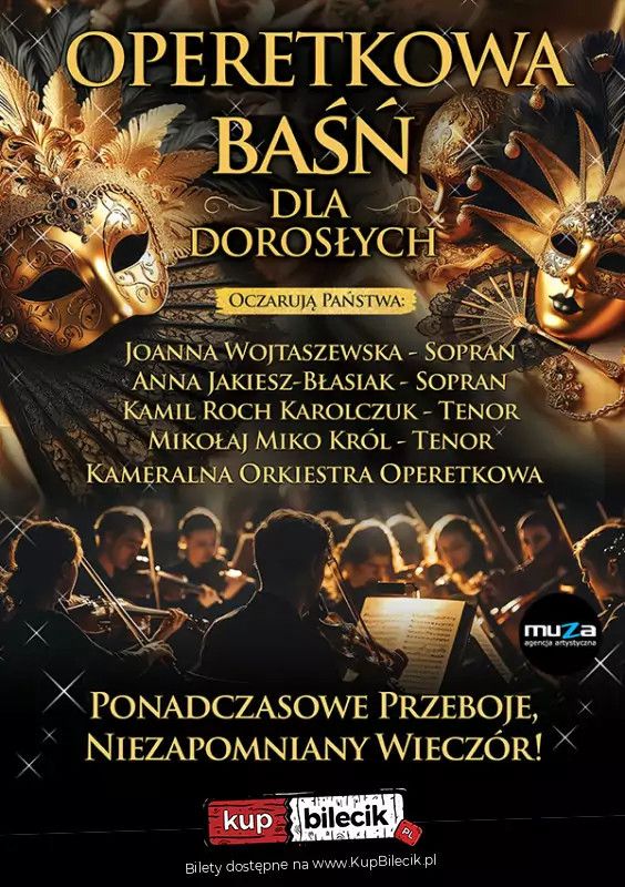 bilety: Drogie Panie, Szanowni Panowie - zapraszamy Was do świata, w którym muzyka uwodzi, zmysły tańczą, a rzeczywistość na chwilę ustępuje miejsca baśni. "Operetkowa Baśń dla Dorosłych" to koncert, który od lat zachwyca publiczność w całej Polsce - spektakl z pogranicza jawy i snu, gdzie elegancja łączy się z humorem, a klasyka z nowoczesną fantazją. To niezwykłe widowisko sceniczne w którym wzruszenie miesza się z uśmiechem. Scenę rozświetlają bajeczne kostiumy, pełne uroku choreografie i artyści, którzy nie tylko śpiewają, lecz także prowadzą widzów przez koncert jak przez magiczną opowieść. To koncert, który zaskakuje na każdym kroku. Publiczność - nie tylko słucha, ale współtworzy atmosferę. Od pierwszych taktów do ostatnich braw - jesteście częścią tej baśni. Występują: Joanna Wojtaszewska - sopran o krystalicznej barwie i scenicznej charyzmie Anna Jakiesz-Błasiak - sopran o aksamitnym głosie i teatralnym wdzięku Kamil Roch Karolczuk - tenor o magnetycznej sile wyrazu - mistrz scenicznego uroku Mikołaj "Miko" Król - tenor o niepowtarzalnej barwie i uroku osobistym Kameralna Orkiestra Operetkowa - stylowi wirtuozi, którzy z lekkością i elegancją malują dźwiękiem tło tej operetkowej baśni. Artyści koncertu to nie tylko wykonawcy - to przewodnicy po świecie muzycznej magii. Każdy z nich wnosi na scenę własną energię, talent i niepowtarzalny styl, tworząc razem widowisko, które na długo zapada w pamięć. To nie tylko koncert. To spektakl. To show. To zmysłowa podróż przez świat muzyki, tańca i wyobraźni. Wejdźcie z nami w świat, gdzie każdy takt ma smak, każdy dźwięk iskrzy, a każda piosenka opowiada historię. Czas trwania: ok. 90 minut magicznych emocji (bez przerwy). Bilety do nabycia na: KupBilecik.plOperetkowa baśń dla dorosłych artyści: Joanna Wojtaszewska, Anna Jakiesz-Błasiak, Kamil Roch Karolczuk, Mikołaj Miko KrólMariaż gatunków muzycznych - operetki i musicalu w niezapomnianym koncercie, podczas którego przeniesiemy się na deski największych teatrów muzycznych, gdzie wyśpiewana miłość nie może równać się z żadną inną formą jej wyrażania. Doskonale dobrany repertuar to wspaniałe dzieła operetkowe i największe hity kultowych widowisk muzycznych. Znakomite aranżacje wielokrotnie nagradzanych utworów, choreografia i zjawiskowe kreacje wprowadzą w niepowtarzalny klimat. Bilety do nabycia na: KupBilecik.pl |