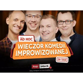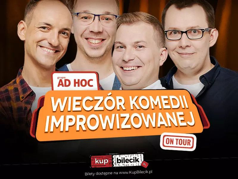 bilety: "Wieczór Komedii Improwizowanej" to niepowtarzalne SHOW komediowe składające się z kilkunastu gier, scen, skeczy i piosenek, tworzonych NA ŻYWO w oparciu o sugestie publiczności! To właśnie Ty, będziesz mógł zdecydować o postaciach, miejscach akcji, tematyce i losach bohaterów, stając się współreżyserem tego nieszablonowego wydarzenia. Każdy występ to jednocześnie premiera i ostatni spektakl - nic nie powtórzy się dwa razy! Grupa AD HOC - powstała w 2008 roku i jako jedna z pierwszych w Polsce zajęła się improwizacją komediową. Przez 15 lat swojej działalności zagrała blisko 600 występów przed tysiącami widzów w całym kraju. Czego możecie się spodziewać? Wszystkiego! WARTO WIEDZIEĆ: Grupa AD HOC artyści: Aneta Stokes, Alan Pakosz, Jan Malinowski, Michał "Jeffrey" Ociepa, Michał PróchniewiczGrupa AD HOC - powstała w październiku 2008 roku, jako jedna z pierwszych w Polsce grup zajmujących się improwizacją teatralno-komediową. Wszystkie spektakle są premierowe, tworzone są na scenie na żywo, bez scenariusza, w oparciu o sugestie publiczności i nieograniczoną wyobraźnię improwizatorów. Członkowie grupy swoją wiedzę i doświadczenie zdobywali na warsztatach z instruktorami z całego świata. AD HOC to kilkaset godzin występów i przeprowadzonych w całej Polsce warsztatów improwizacji. Grupa często gości na festiwalach teatralnych, kabaretowych i improwizacyjnych. Pomysłodawcy i organizatorzy największego w Polsce festiwalu improwizacji komediowej "ImproFest" Bilety do nabycia na: KupBilecik.pl |